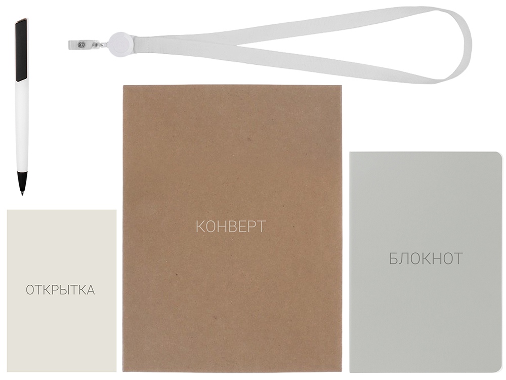 Материал товара: блокнот - искусственная кожа, открытка - бумага, пакет - картон, ручка - пластик с покрытием soft-touch, ланьярд с ретрактором - полиэстер, металл, пластик.