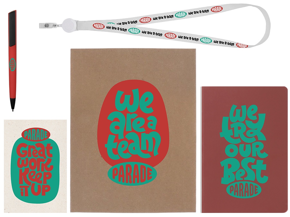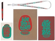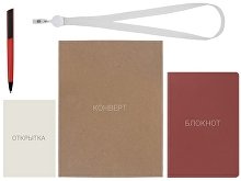 Материал товара: блокнот - искусственная кожа, открытка - бумага, пакет - картон, ручка - пластик с покрытием soft-touch, ланьярд с ретрактором - полиэстер, металл, пластик.