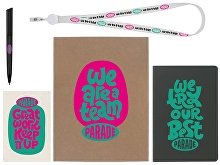 Материал товара: блокнот - искусственная кожа, открытка - бумага, пакет - картон, ручка - пластик с покрытием soft-touch, ланьярд с ретрактором - полиэстер, металл, пластик.