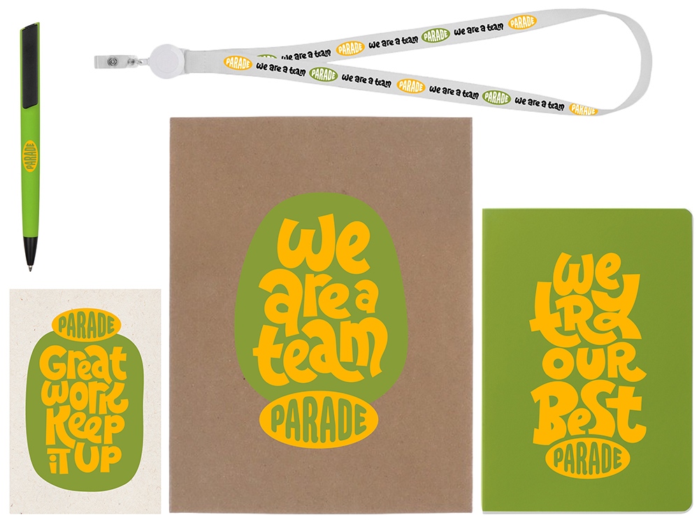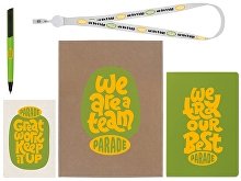 Материал товара: блокнот - искусственная кожа, открытка - бумага, пакет - картон, ручка - пластик с покрытием soft-touch, ланьярд с ретрактором - полиэстер, металл, пластик.