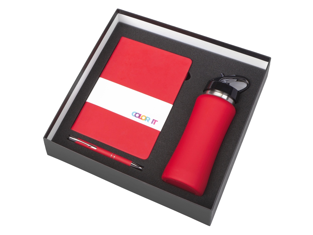 Материал товара: блокнот - искусственная кожа с покрытием soft-touch, ручка - алюминий с покрытием soft-touch, бутылка - нержавеющая cталь/пластик с покрытием soft-touch, коробка - картон