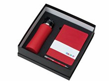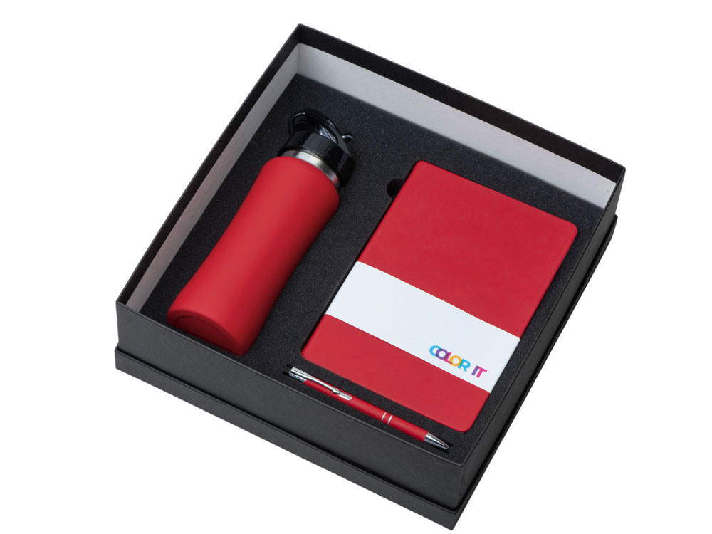 Материал товара: блокнот - полиуретан с покрытием софт-тач, ручка - алюминий с покрытием soft-touch, бутылка - нержавеющая cталь/пластик с покрытием soft-touch, коробка - картон