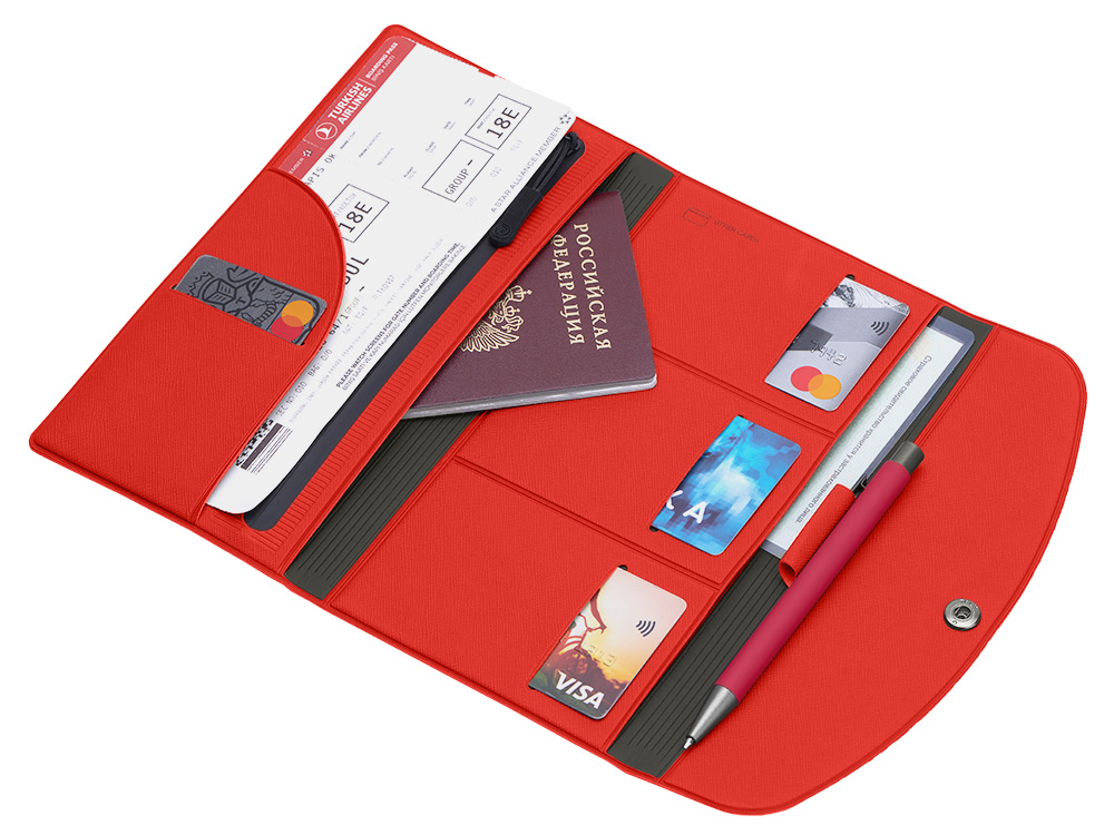 - Удобные отделения для паспорта, билетов, карт и страхового полиса.