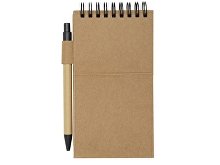 Липкий блокнот с шариковой ручкой. В блокноте 30 листов белой линованной бумаги плотностью 70 г/м2 (8 x 12 см). В комплект также входят 25 разноцветных (5 x 1,2 см) и 25 желтых (7,5 x 7,5 см) клейких листочков, оба типа на бумаге плотностью 70 г/м2. Корпус шариковой ручки изготовлен из переработанной бумаги. Цвет чернил: черный. Длина непрерывной линии: 1000 метров. Размер пера: 1,00 мм.