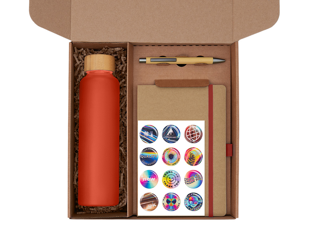 Набор "Wooden" станет отличным подарком для сотрудников, клиентов и партнёров, подчеркнёт внимание к их комфорту и заботу о деталях. Он уместен как корпоративный подарок на праздники, юбилеи и деловые мероприятия, так и в качестве welcome-набора для новых коллег. Набор объединяет всё необходимое для комфортного рабочего дня:  Блокнот для идей, заметок и планов на день; Ручка, которая всегда под рукой; Стеклянная бутылка для воды объемом 600 мл., чтобы поддерживать водный баланс в течение дня; Бамбуковая подставка для телефона, чтобы держать гаджет в поле зрения во время работы или видеозвонков;  Набор стикеров — для ярких акцентов и персонализации вещей Универсальный ложемент обеспечивает аккуратное размещение и надёжную фиксацию элементов, делая набор эффектным и презентабельным при вручении. Дополнительное преимущество — набор доступен в конструкторе наборов: компоненты можно заменить и собрать индивидуальный вариант под стиль компании или вкусы получателя.