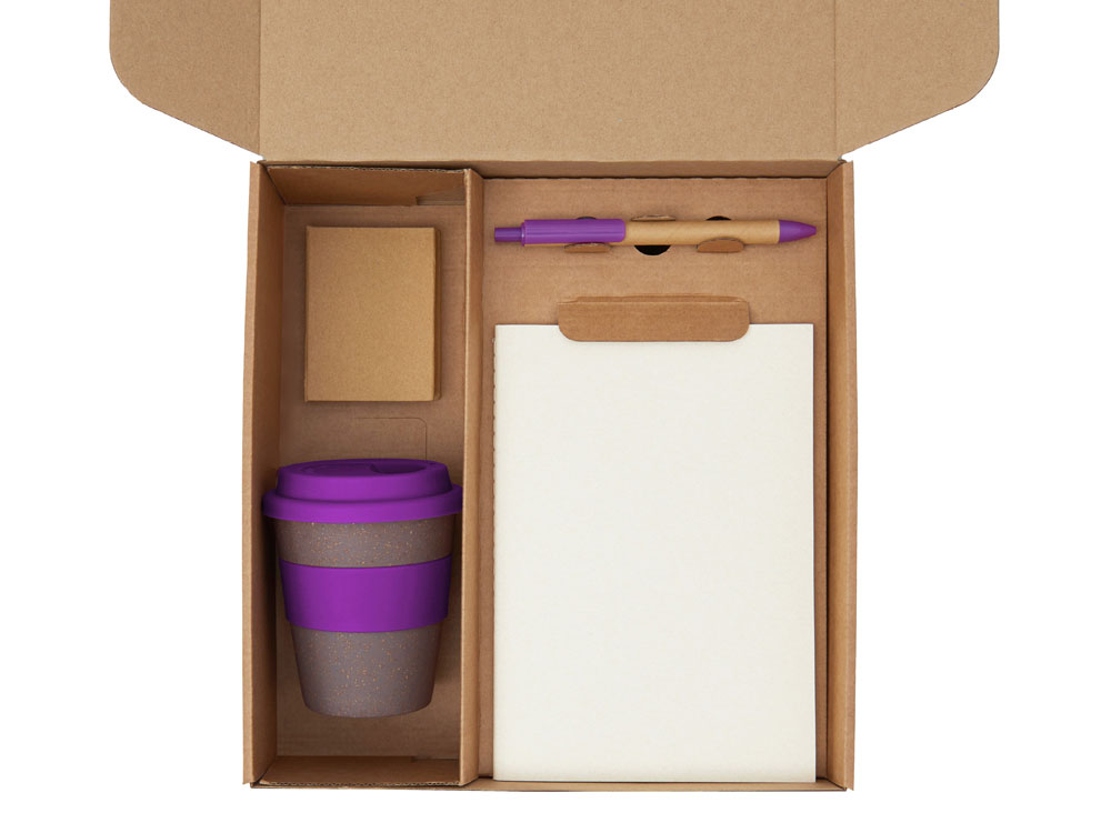 Материал товара: блокнот- бумага из переработанных тетра-паков, ручка- картон, пластик, стакан- 50% бамбуковое волокно, 50% полипропилен, коробка- картон
