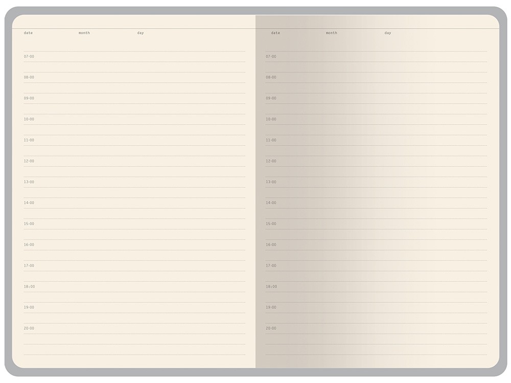 Бумажный блок, закрепленный книжным переплетом, выполнен из бежевой офсетной бумаги плотностью 70 г/ кв м. Внутри блока есть страница для персональных данных, справочная информация на 13 страницах. Блок для записей имеет линовку с указанием временных интервалов в один час.