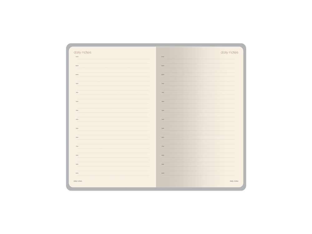 - раздел для планирования имеет линовку серого цвета с указанием времени (интервалы в один час) и выполнен из бежевой бумаги плотностью 70 г/кв.м;