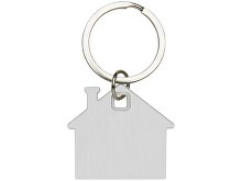 Брелок для ключей в форме домика с цветной вставкой из пластика между 2-мя серебристыми пластинами из стали.