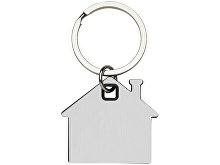 Брелок для ключей в форме домика с цветной вставкой из пластика между 2-мя серебристыми пластинами из стали.