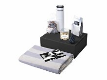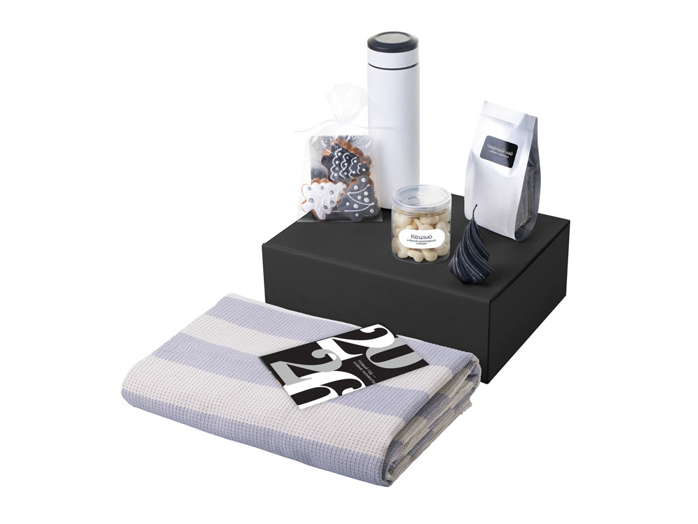 Материал товара: плед - 100% хлопок, мешок - нетканый материал (спанбонд), термос - нержавеющая cталь с покрытием soft-touch, открытка - бумага