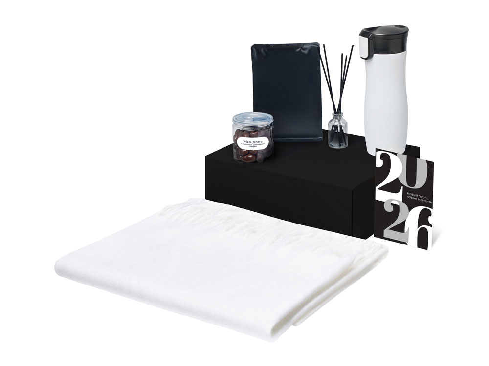 Материал товара: палантин - 100% полиэстер, термокружка - нержавеющая сталь, открытка - бумага, мешок - нетканый материал (спанбонд)