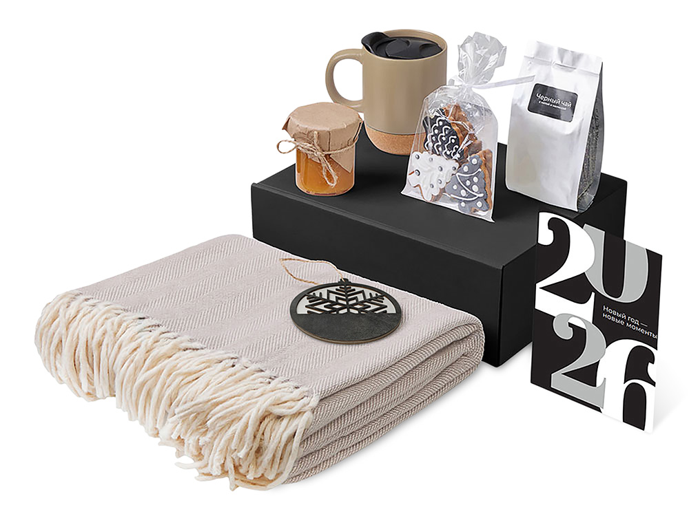 Материал товара: плед - 100% хлопок; кружка - керамика, пробка; подвеска - дерево; открытка - бумага