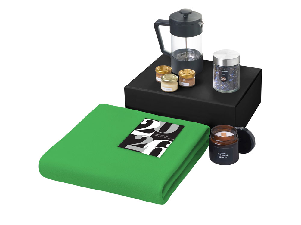 Материал товара: плед - флис 100% полиэстер; френч-пресс - боросиликатное стекло, нержавеющая сталь, пластик; открытка - бумага; мешок - нетканый материал (спанбонд)