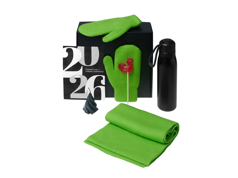 Материал товара: варежки - 100% акрил; шарф - 100% акрил; термос - нержавеющая сталь; открытка - бумага; мешок - нетканый материал