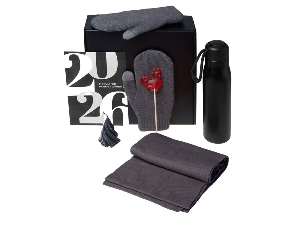 Материал товара: варежки - 100% акрил; шарф - 100% акрил; термос - нержавеющая сталь; открытка - бумага; мешок - нетканый материал