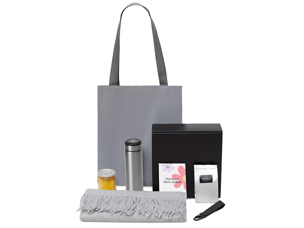 Материал товара: палантин - полиэстер, термос - нержавеющая сталь, чай - пластик - брелок-ремувка - искусственная кожа, металл, манго - пластик, светоотражающая сумка - полиэстер, мешок - нетканый материал (спанбонд), коробка - картон