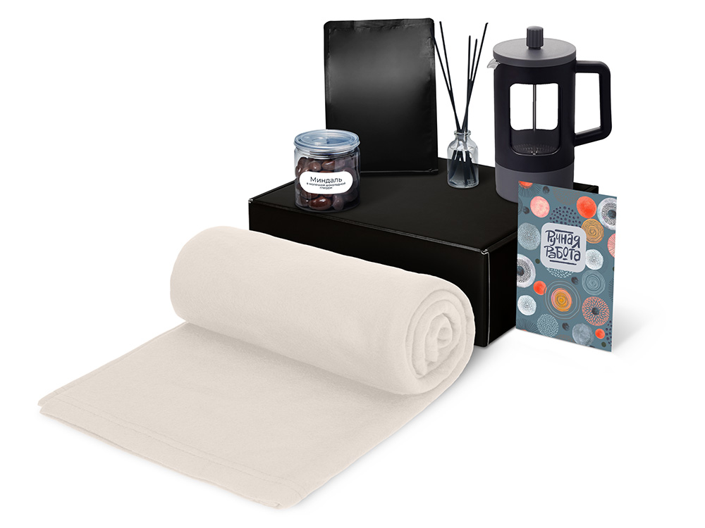 Материал товара: плед - флис, полиэстер, кофе - пластик, френч-пресс - нержавеющая сталь, боросиликатное стекло, ПП пластик, диффузор - стекло, миндаль - пластик, мешок - нетканый материал (спанбонд), коробка - картон