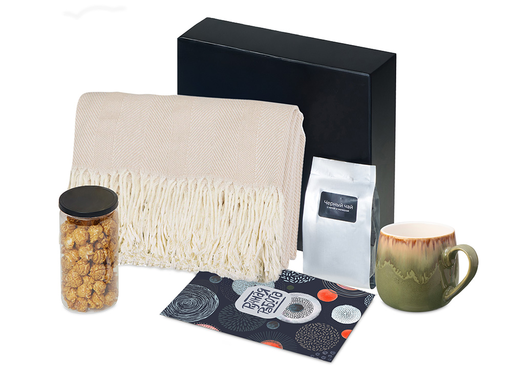 Материал товара: плед - 100% хлопок, кружка - костяной фарфор с покрытием софт-тач, чай - пластик, попкорн - пластик, металл, мешок - нетканый материал (спанбонд), коробка - картон