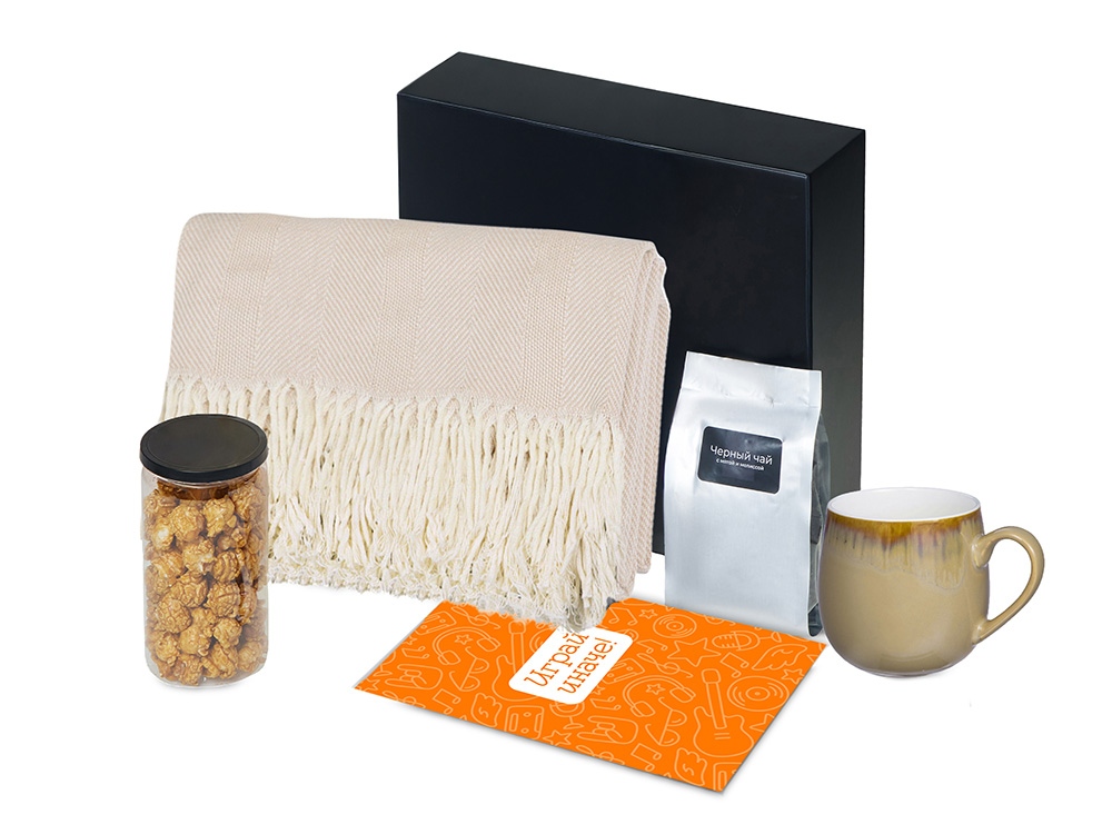Материал товара: плед - 100% хлопок, кружка - костяной фарфор с покрытием софт-тач, чай - пластик, попкорн - пластик, металл, мешок - нетканый материал (спанбонд), коробка - картон
