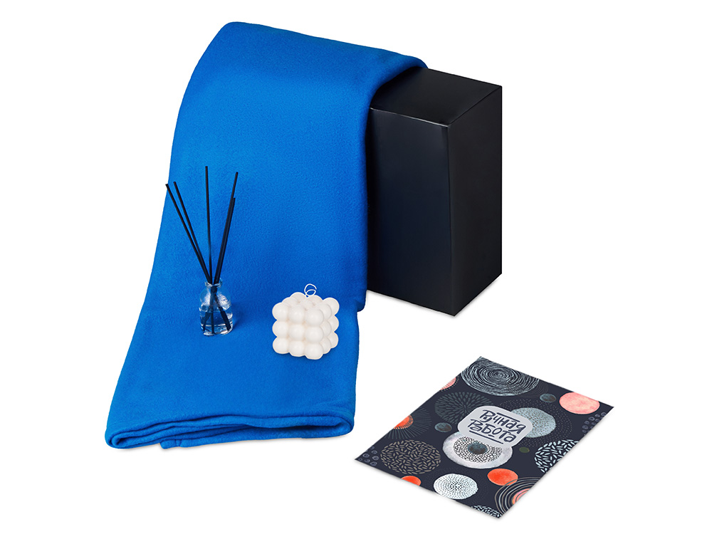 Материал товара: плед - флис, полиэстер, диффузор - стекло, свеча - 90% парафин очищенный, 10% соевого воска, фитиль хлопковый, миндаль - пластик, мешок - нетканый материал (спанбонд), коробка - картон
