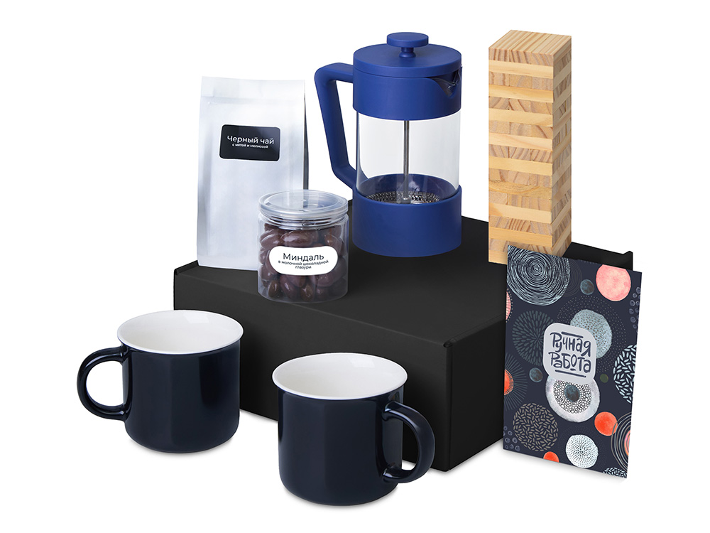 Материал товара: кружка - костяной фарфор, френч-пресс - боросиликатное стекло, нержавеющая сталь, пластик, чай - пластик, игра - сосна, миндаль - пластик, мешок - нетканый материал (спанбонд), коробка - картон