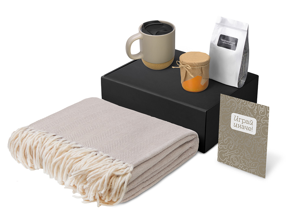 Материал товара: плед - 100% хлопок, кружка - керамика, пробка, чай -пластик, мешок - нектаный материал (спанбонд), коробка -картон