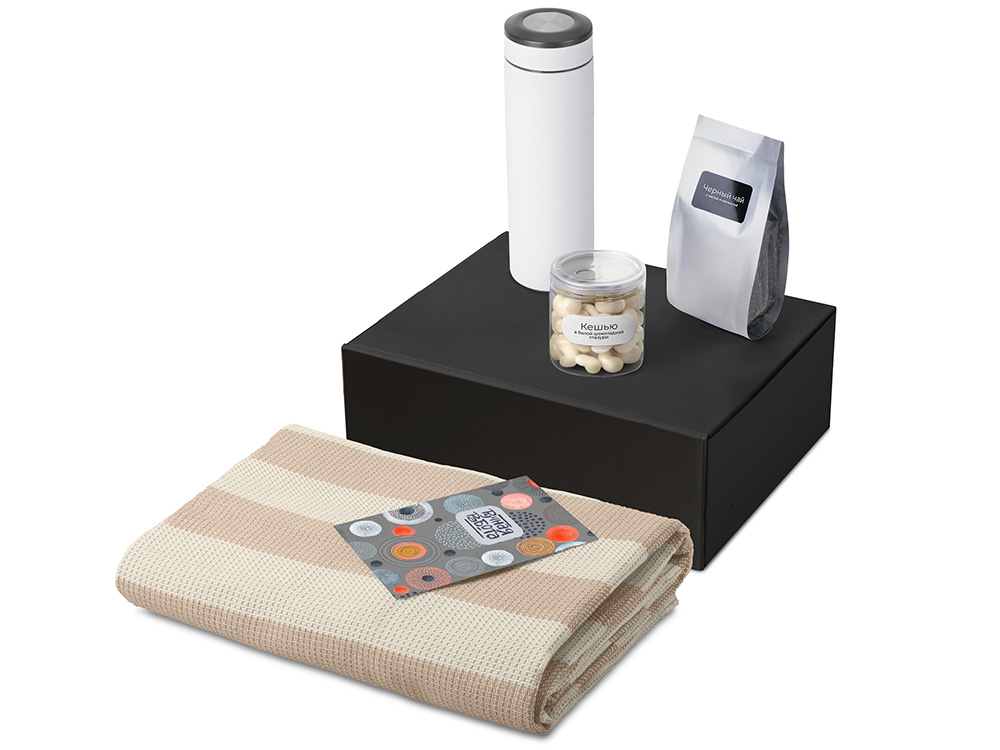 Материал товара: плед - 100% хлопок, термос - нержавеющая сталь с покрытием софт-тач, чай - пластик, мешок - нетканый материал (спанбонд), коробка - картон