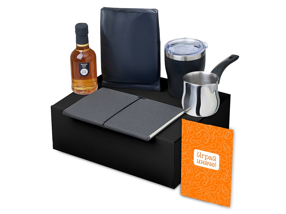 Материал товара: сироп - стекло, блокнот - искусственная кожа, бумага, турка - нержавеющая сталь, бакелит, кофе - пластик, термокружка - нержавеющая сталь, керамика, полипропилен, мешок - нетканый материал (спанбонд), коробка -картон