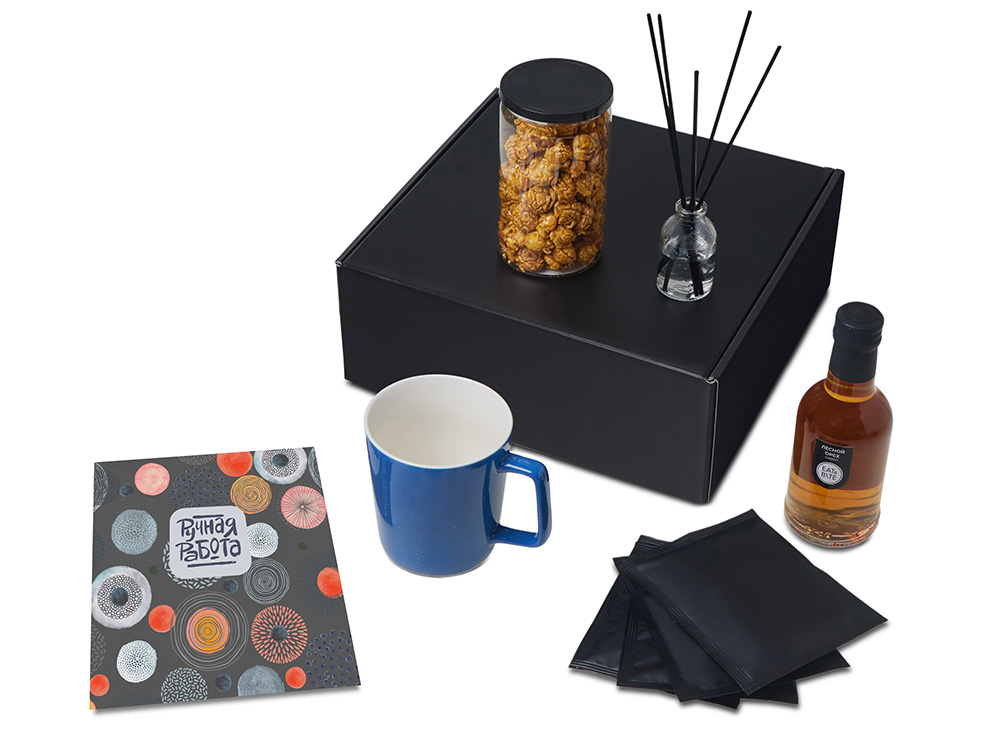 Материал товара: диффузор - стекло, кофе в дрип пакете - пластик, кружка - костяной фарфор, попкорн - пластик, металл, мешок - нетканый материал (спанбонд), коробка - картон