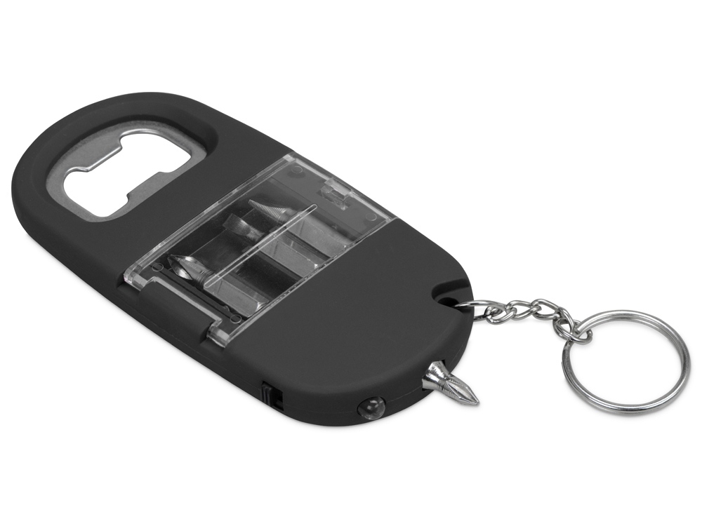 Брелок включает в себя 2 плоские и 2 крестообразные насадки и прочную металлическую открывалку. Корпус сделан из плотного пластика с мягким покрытием soft-touch. Встроенный фонарик позволяет подсвечивать рабочую зону.