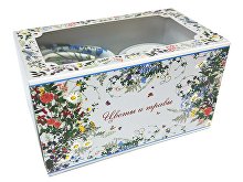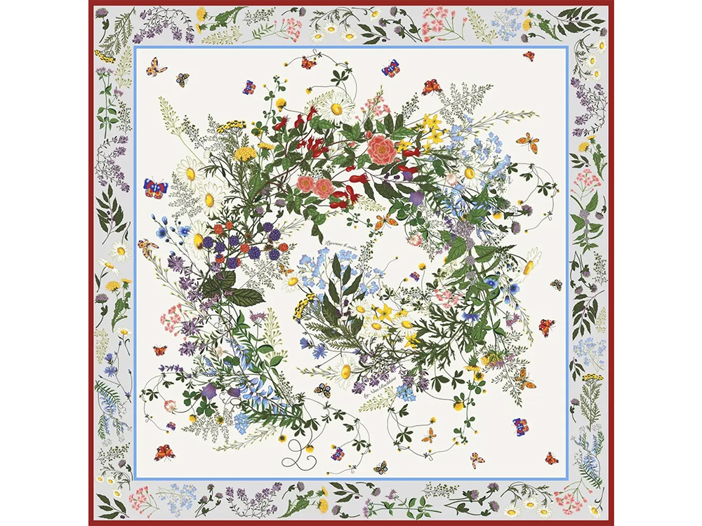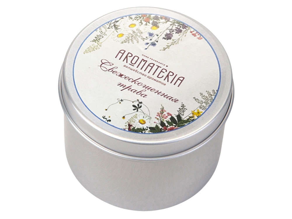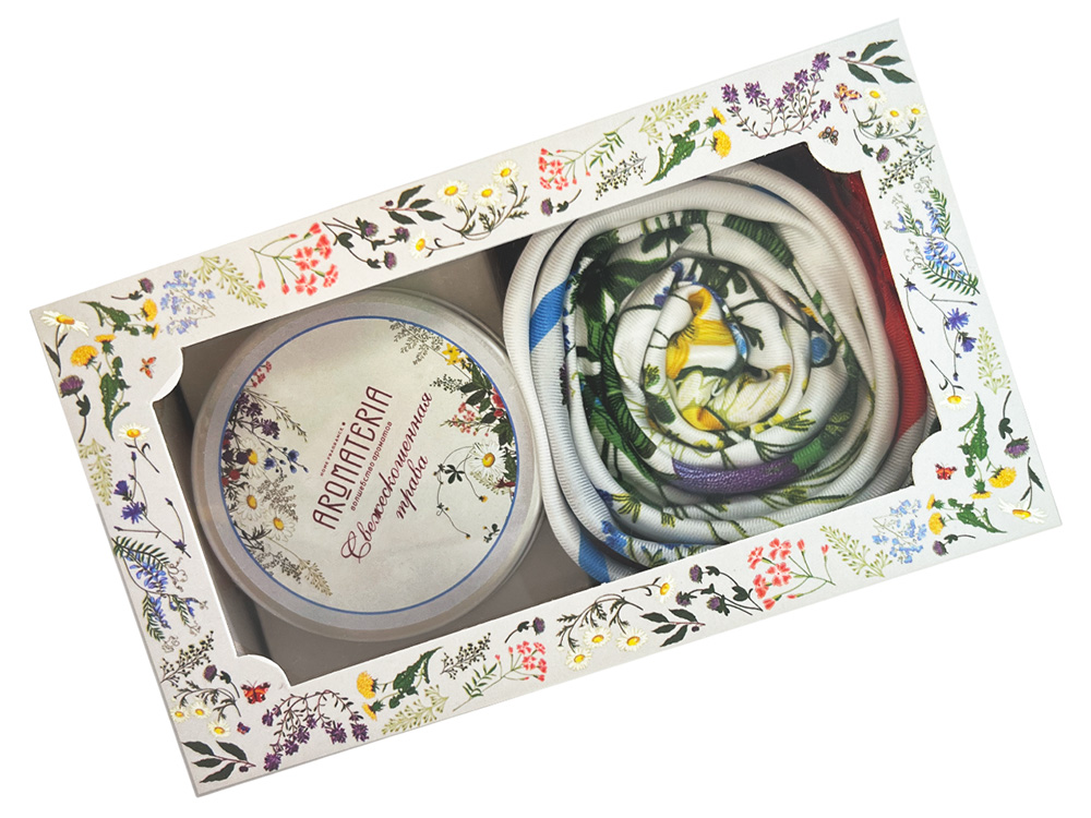 Набор состоит из платка «Русский полевой букет» от бренда «Русские в моде» и ароматической свечи «Ароматные травы» от «AROMATERIA».
