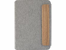 Обложка портфолио A5 Andean изготовлена из переработанного полиэстера, сертифицированного RCS, что является экологичной альтернативой стандартным материалам. Изделие имеет гладкую серую обложку с закругленными углами, а также магнитную застежку, дополненную изысканной деталью из орехового дерева, что придает ему изысканный вид. Внутри блокнот в гибкой обложке с 64 листами бумаги 80 г/м2 кремового цвета в линейку. Поставляется в шубере из крафтовой бумаги
