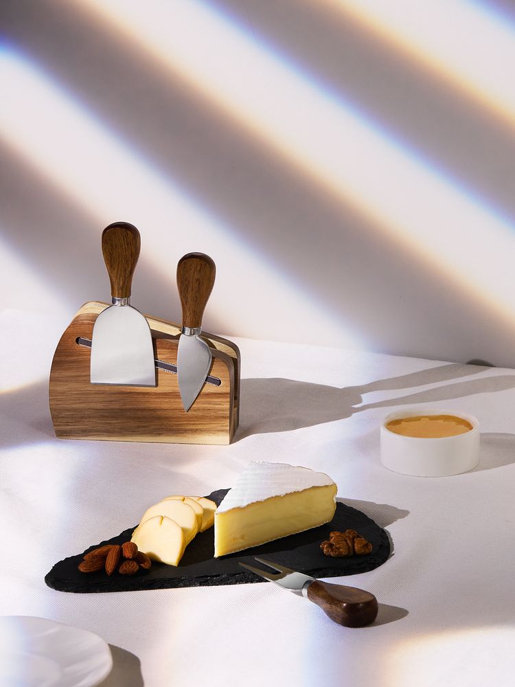 Подставка и рукоятки ножей выполнены из дерева акации, лезвия — из высококачественной нержавеющей стали.
