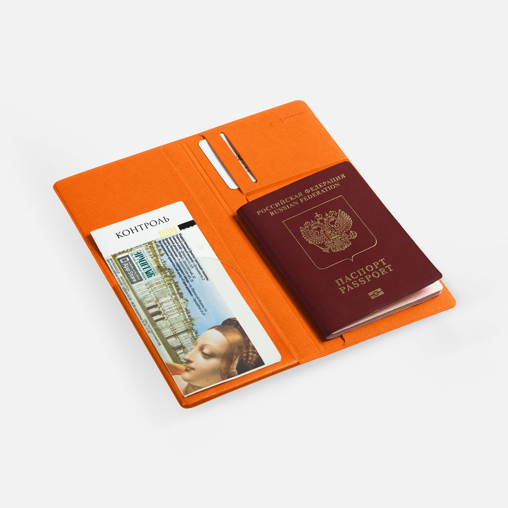 Органайзер из искусственного материала, имитирующего сафьяновую кожу, имеет 5 отделений: для билетов, паспорта, визиток или кредитных карт.