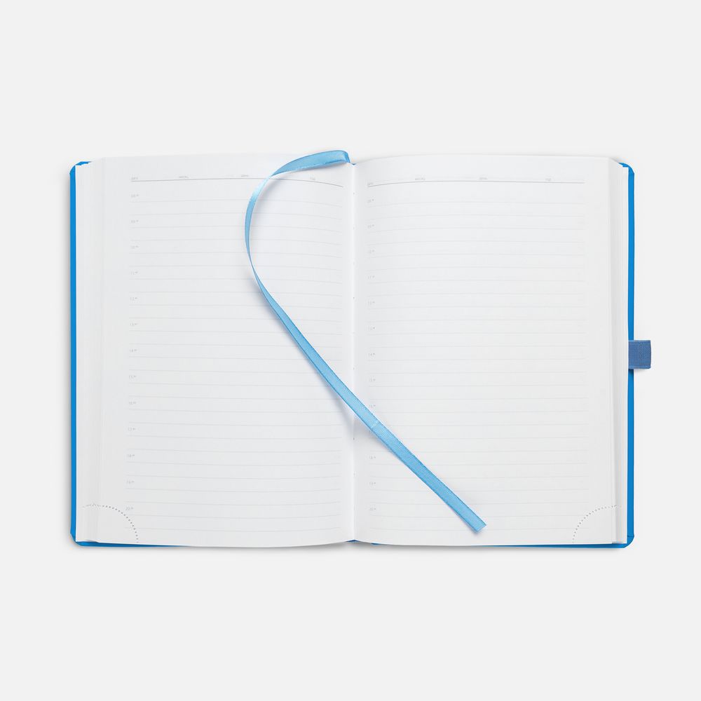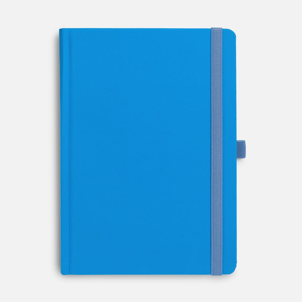 Ежедневник с твердой обложкой без поролона, выполнен из материала Soft Touch Ultra, голубой JJ, дополнен резинкой шириной 1 см, петлей-резинкой для ручки, капталом и ляссе голубого цвета.