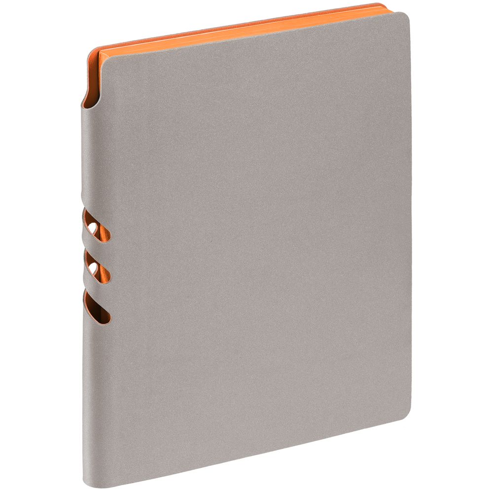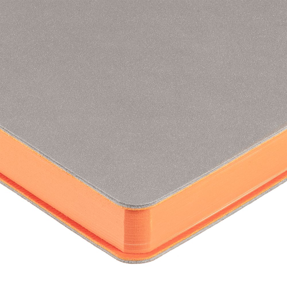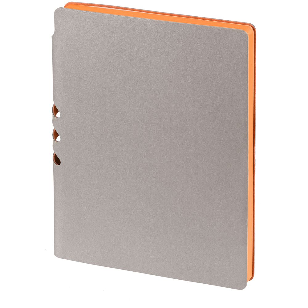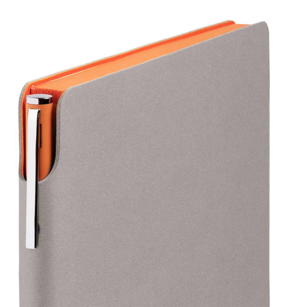 Гибкая обложка выполнена из материала Velour Melange, серый СС и Latte, оранжевый OO (внутренняя часть обложки). Внутри корешка — специальное место для крепления ручки размером до 15х0,9 см.