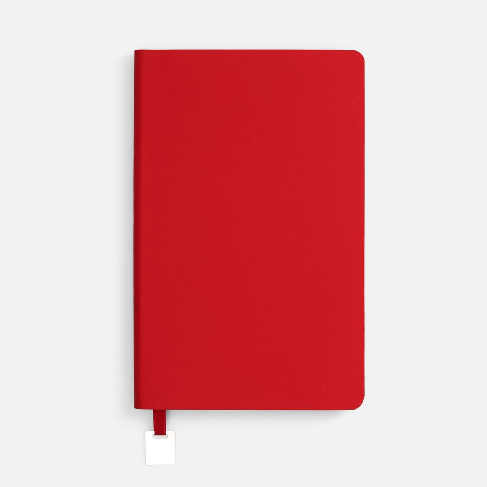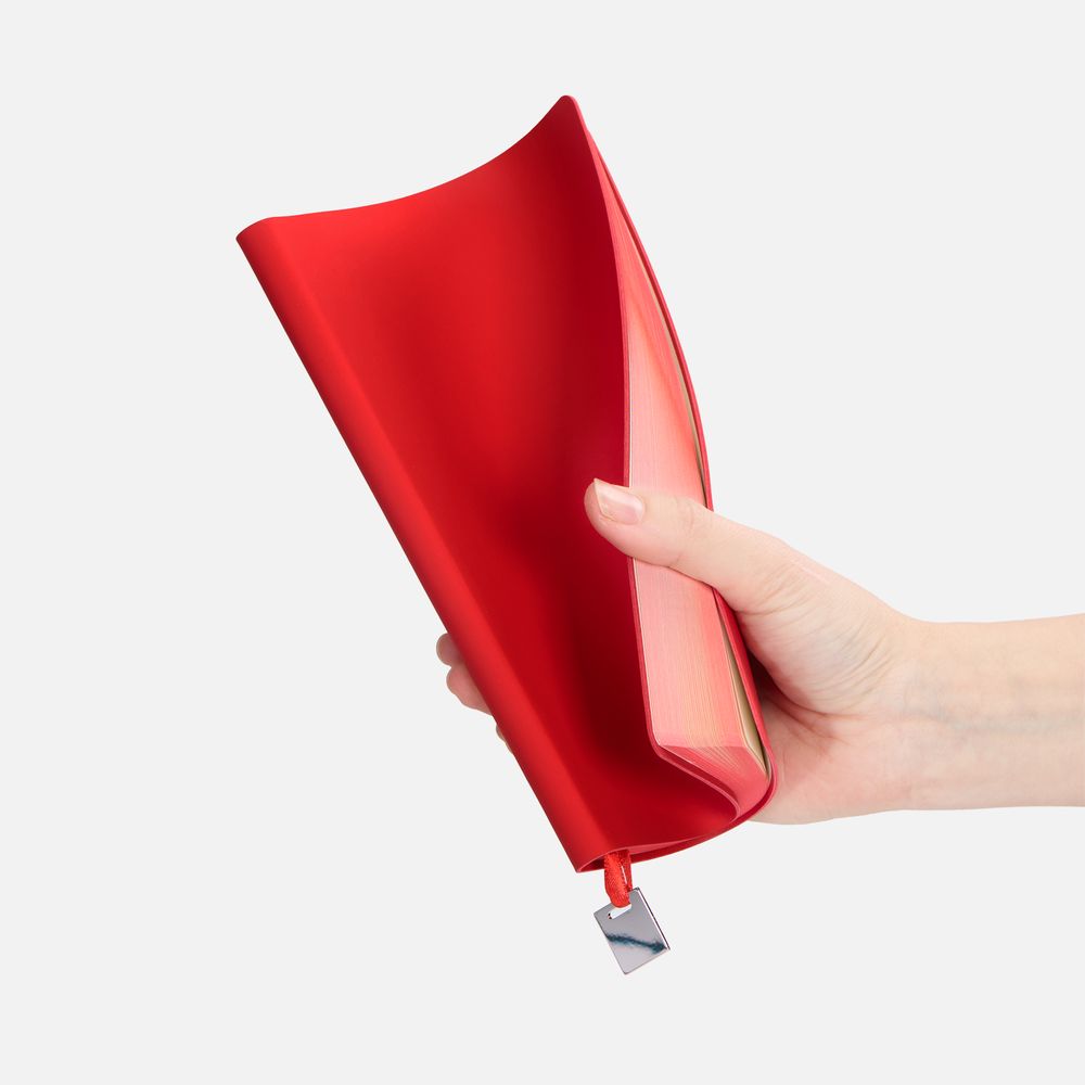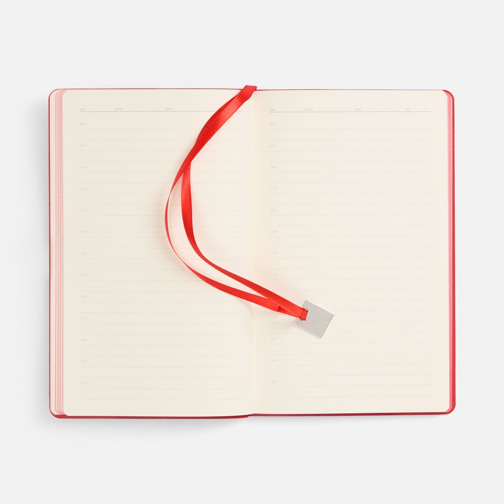 Ежедневник с гибкой обложкой, выполнен из материалов Soft Touch Ultra, красный РР, и Latte, красный (внутренняя часть обложки), дополнен ляссе в цвет обложки с металлическим шильдиком.