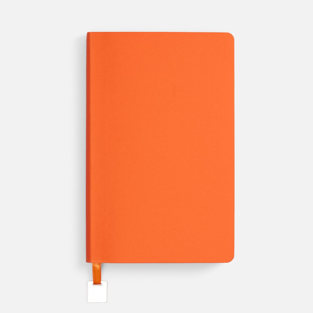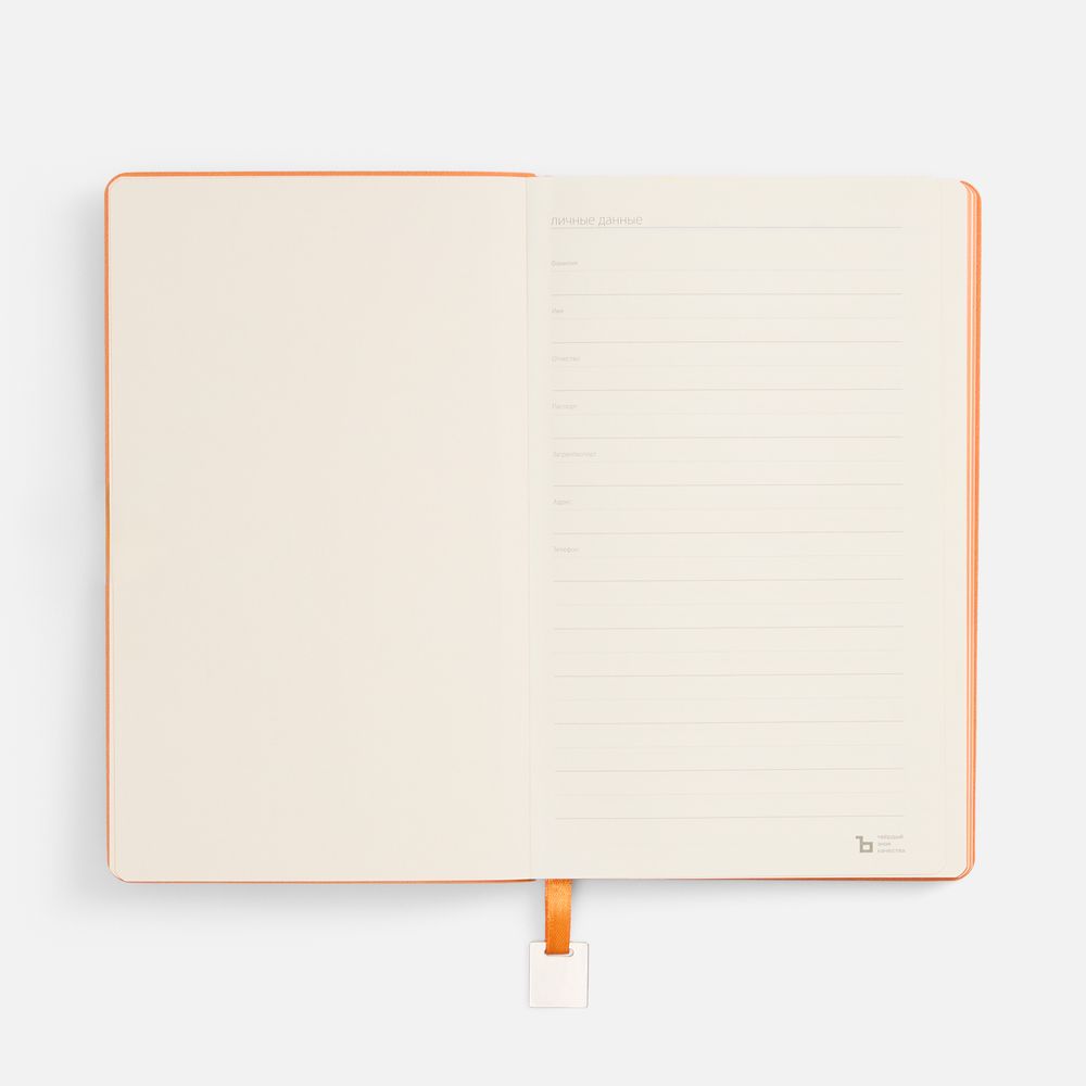 Ежедневник с гибкой обложкой, выполнен из материалов Soft Touch Pearl, оранжевый ОО, и Latte, оранжевый (внутренняя часть обложки), дополнен ляссе в цвет обложки с металлическим шильдиком.