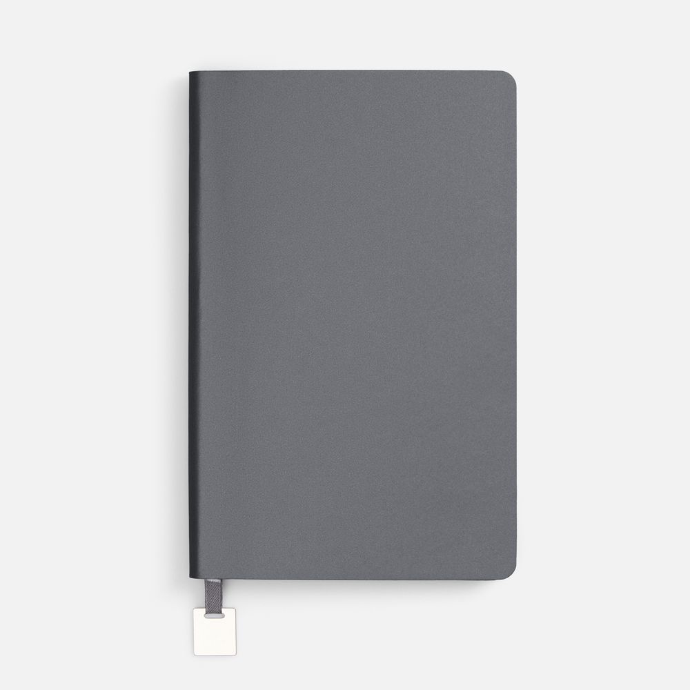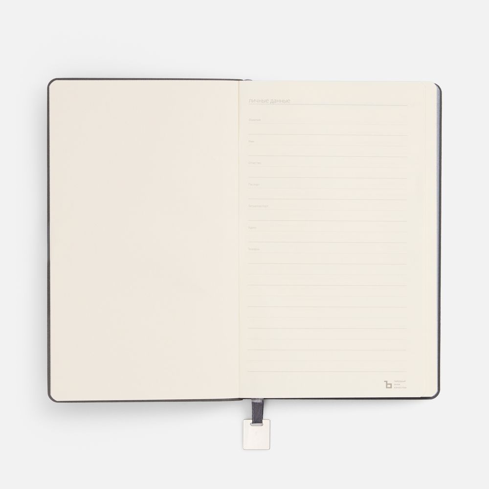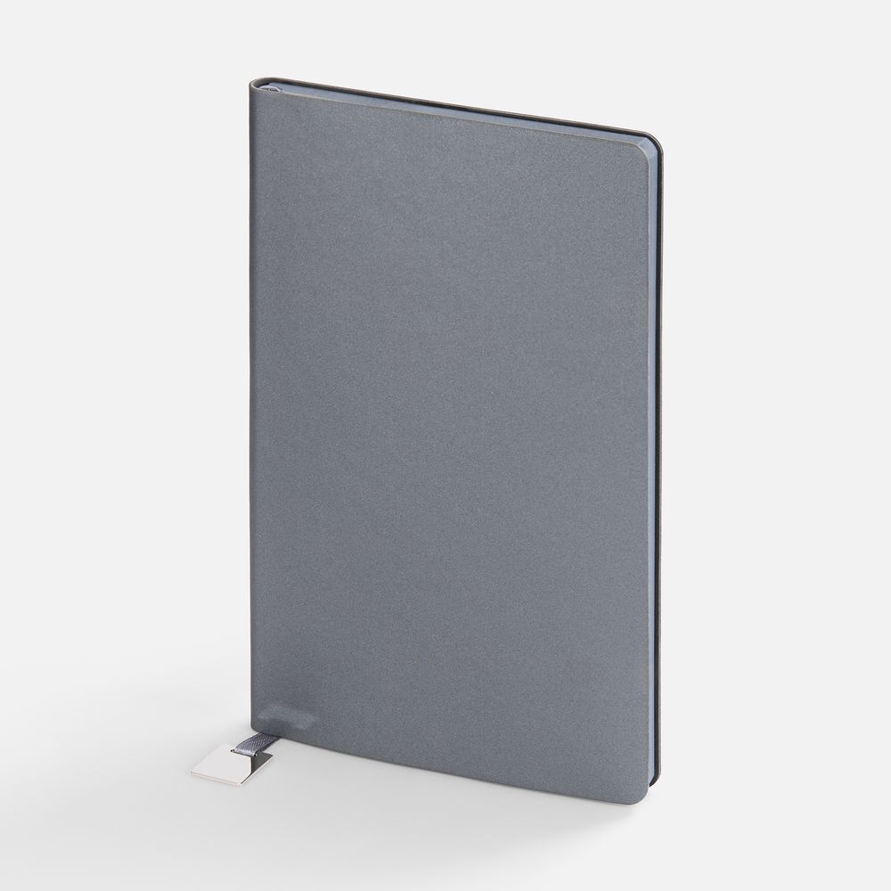 Ежедневник с гибкой обложкой, выполнен из материалов Soft Touch Pearl, серый СС, и Latte, серый (внутренняя часть обложки), дополнен ляссе в цвет обложки с металлическим шильдиком.