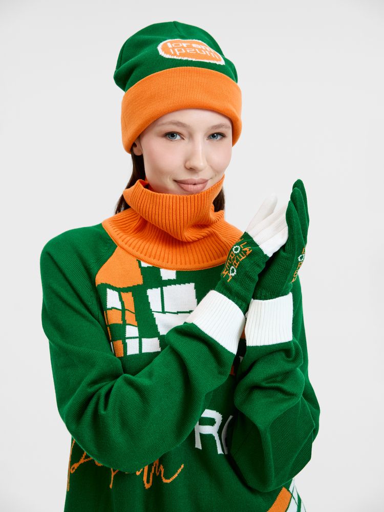 Шапка с вывязанным логотипом и индивидуальным рисунком в фирменной цветовой гамме.