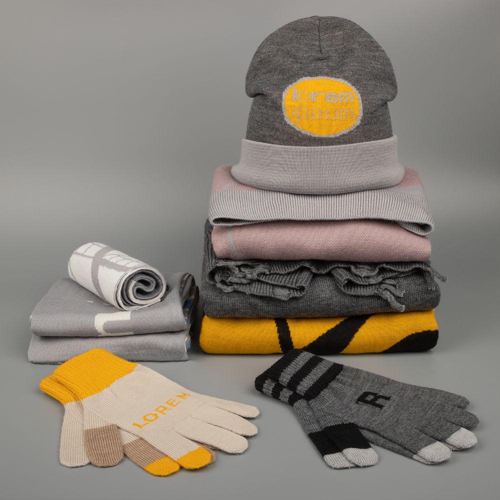 Шапка с вывязанным логотипом и индивидуальным рисунком в фирменной цветовой гамме.