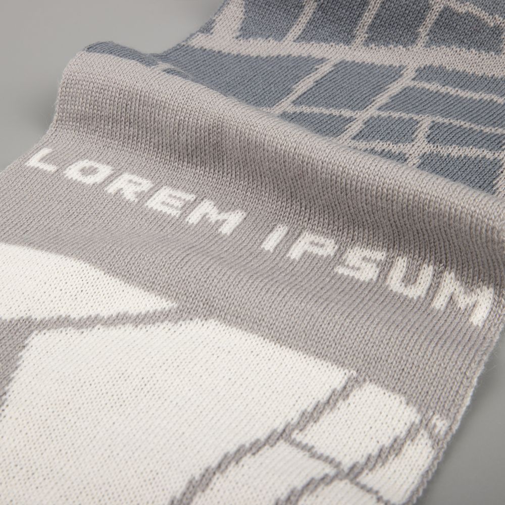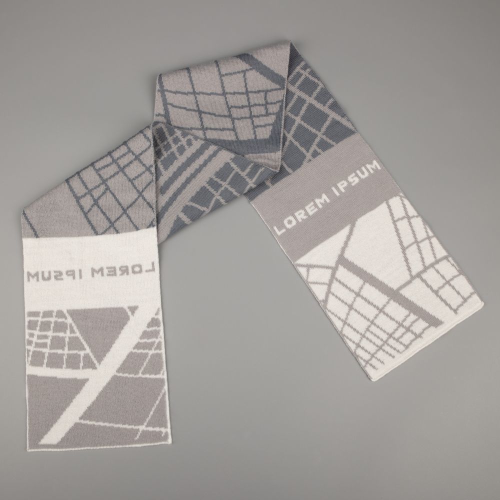 Шарф с вывязанным логотипом и индивидуальным рисунком в фирменной цветовой гамме.