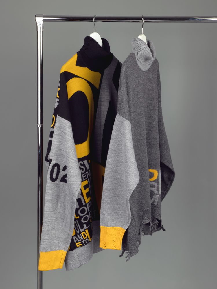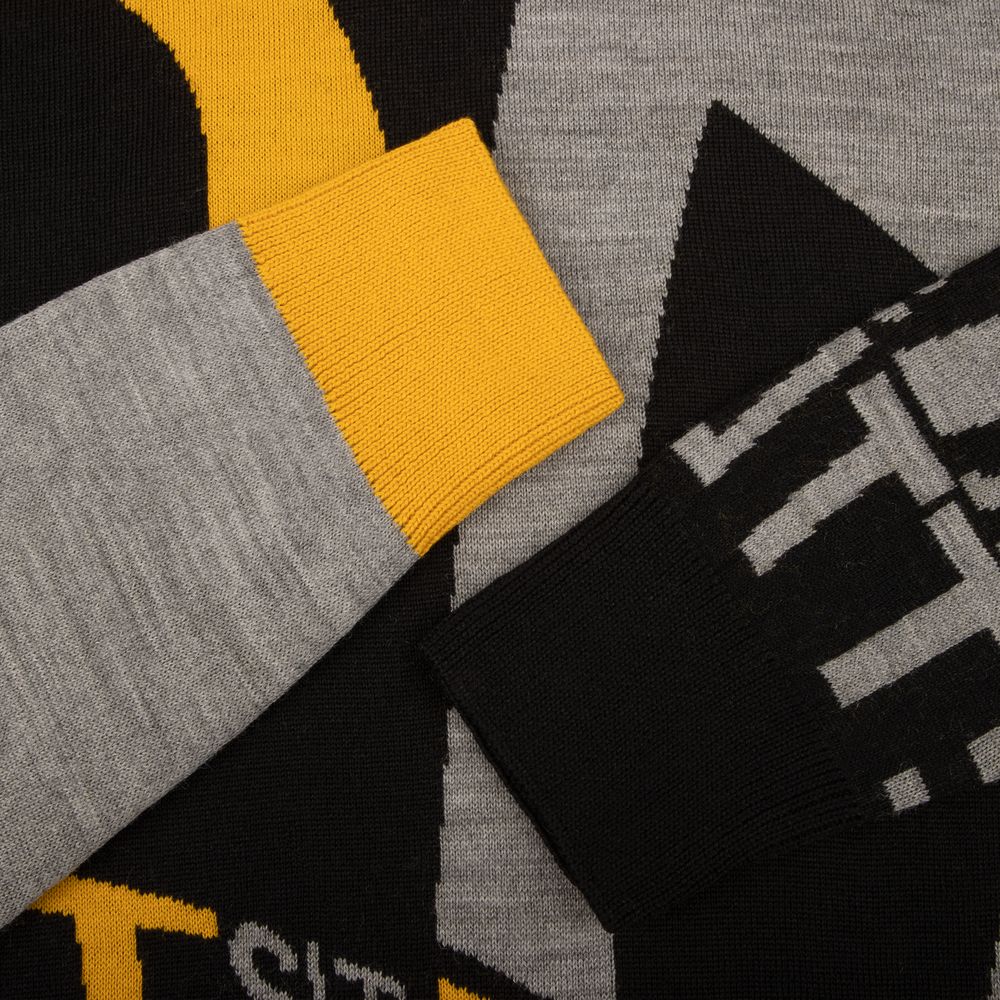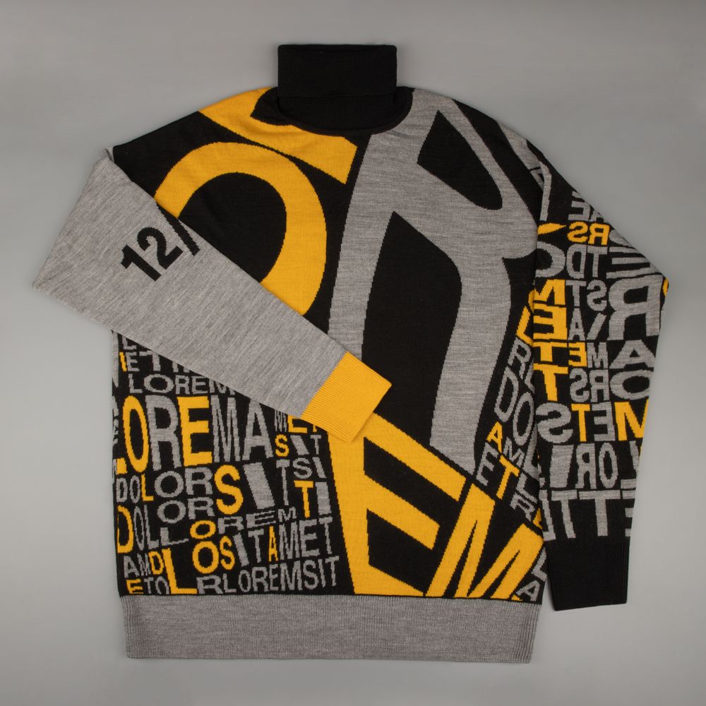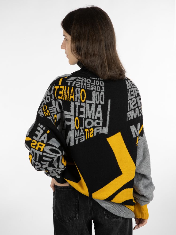 Свитер унисекс с вывязанным логотипом и индивидуальным рисунком в фирменной цветовой гамме.