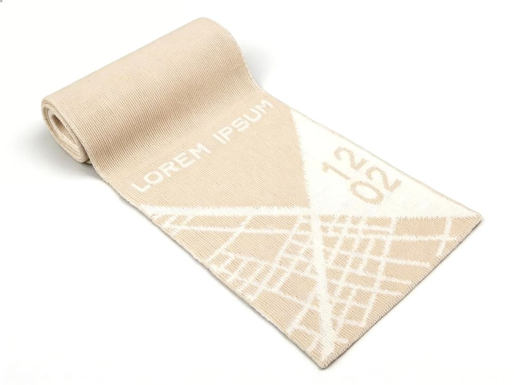 Шарф с вывязанным логотипом и индивидуальным рисунком в фирменной цветовой гамме.