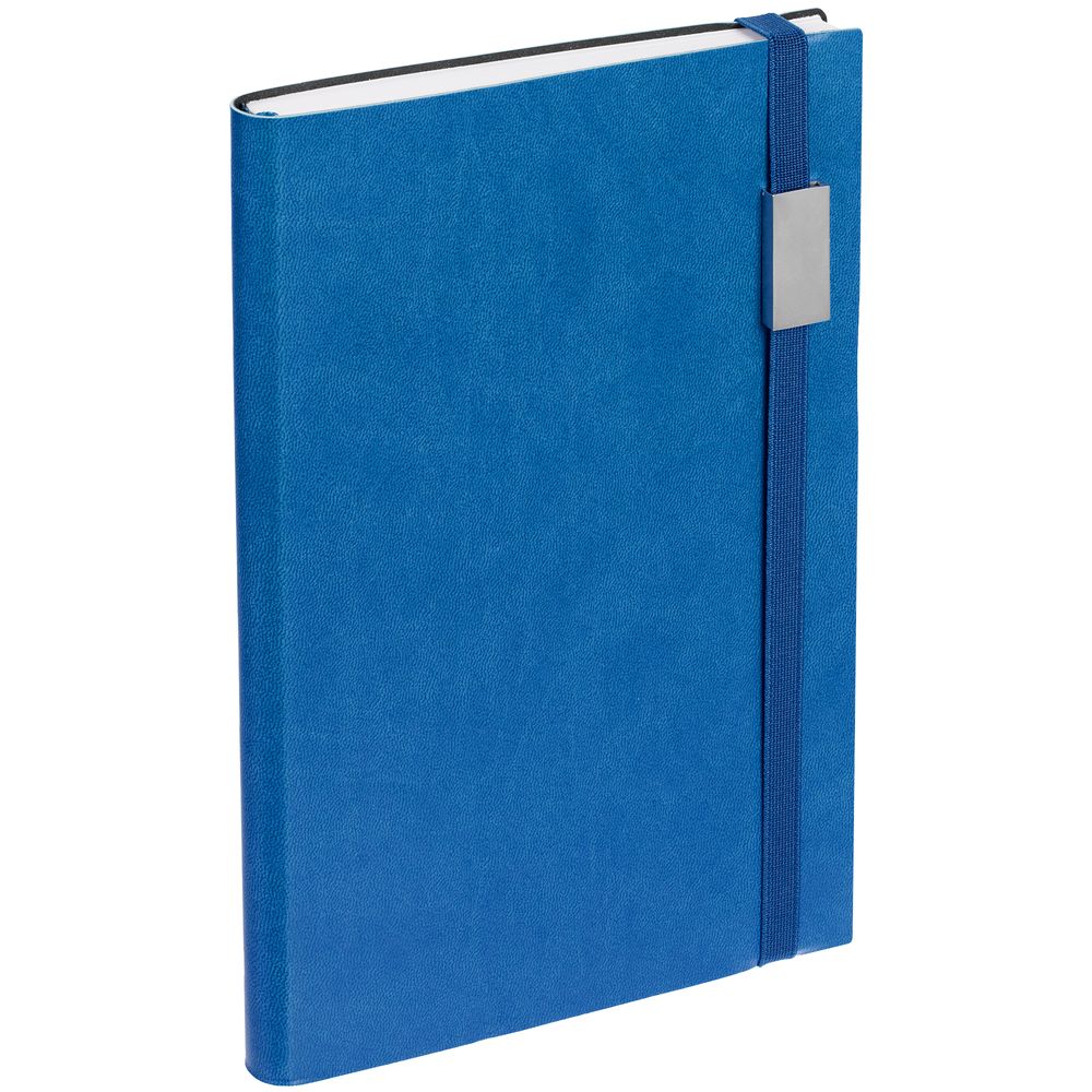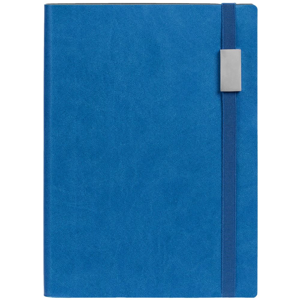 Ежедневник с гибкой обложкой, выполнен из материала Latte, синий НН, дополнен резинкой шириной 1 см с металлическим шильдом, капталом и ляссе синего цвета.
