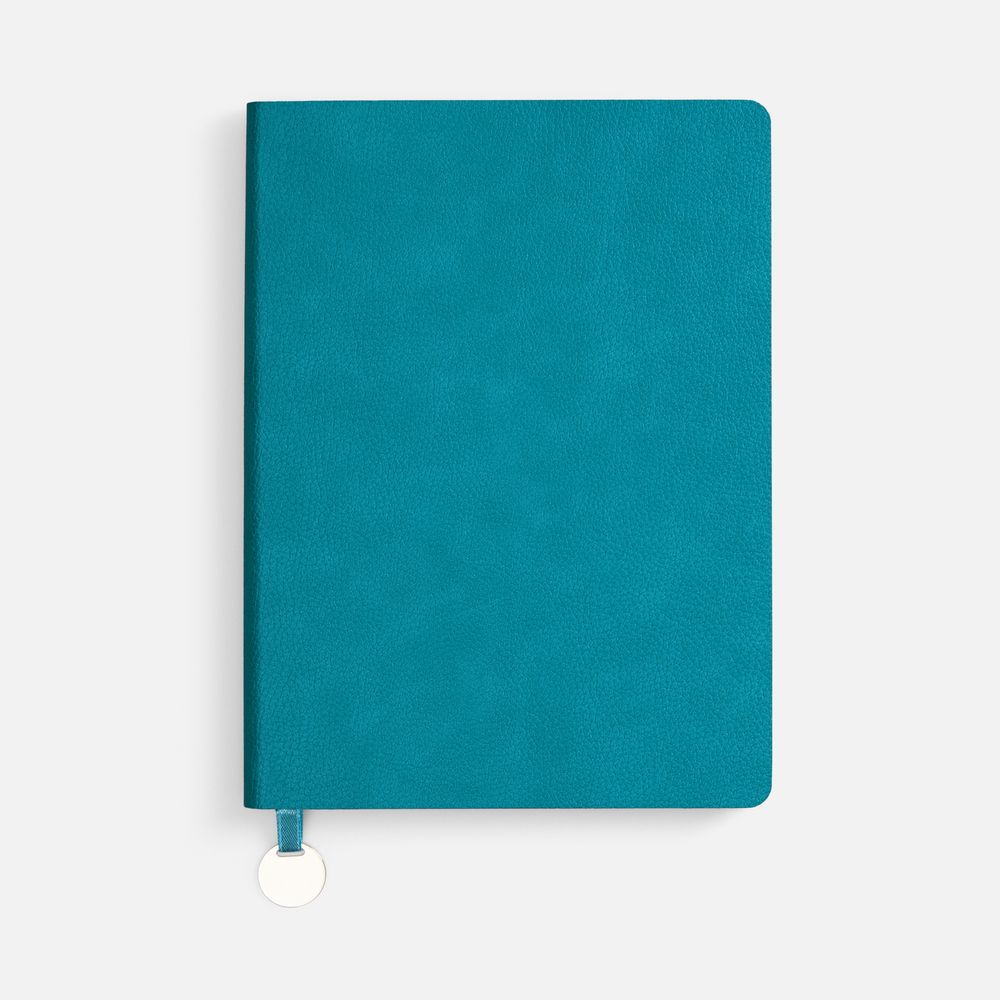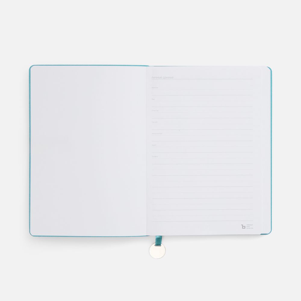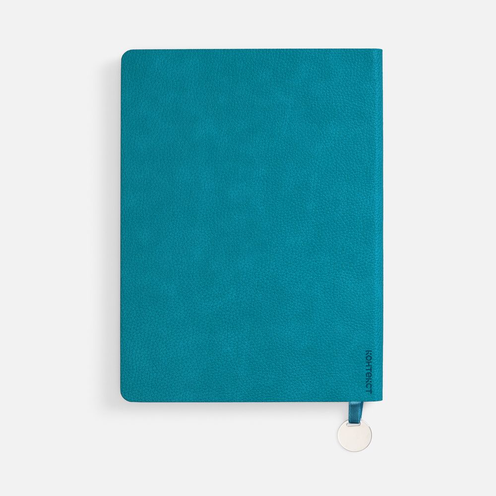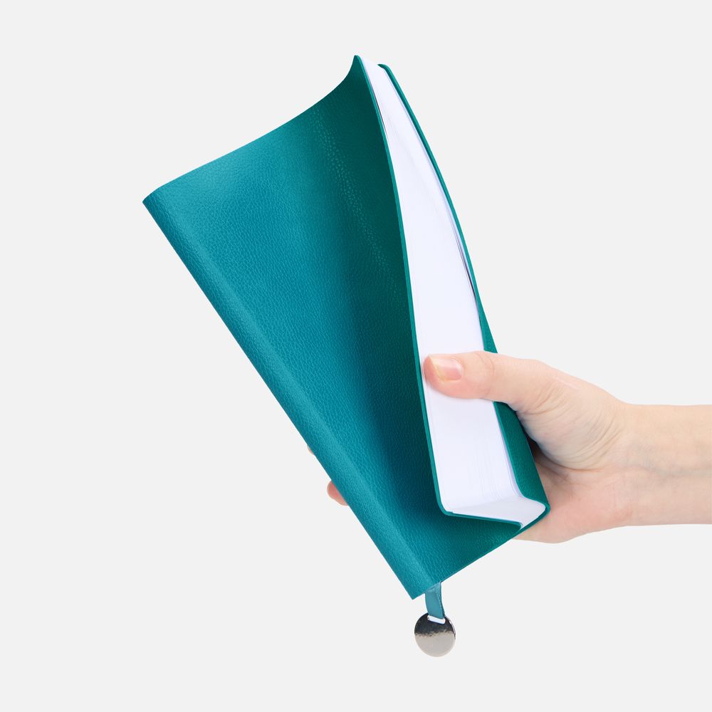 Ежедневник с гибкой обложкой, выполнен из материал La Fite, цвет морской волны II, дополнен ляссе в цвет обложки с металлическим шильдом.