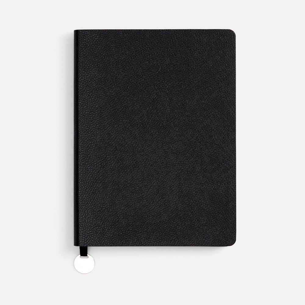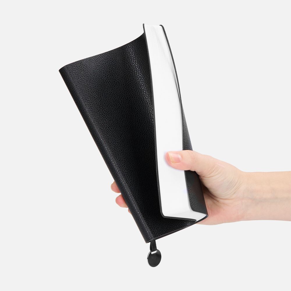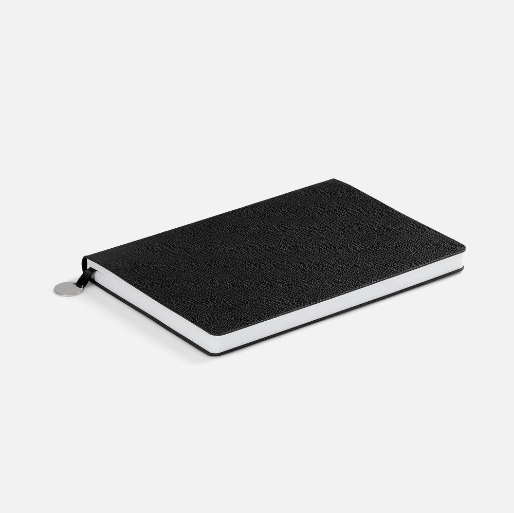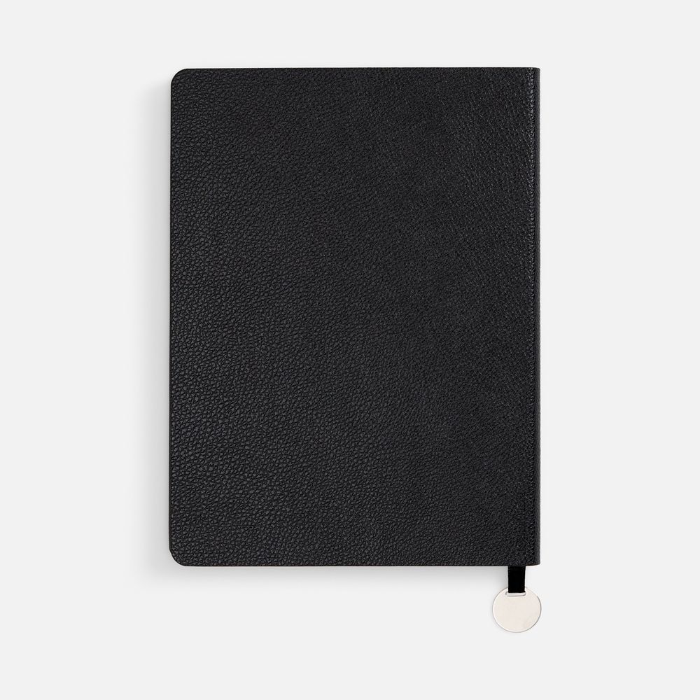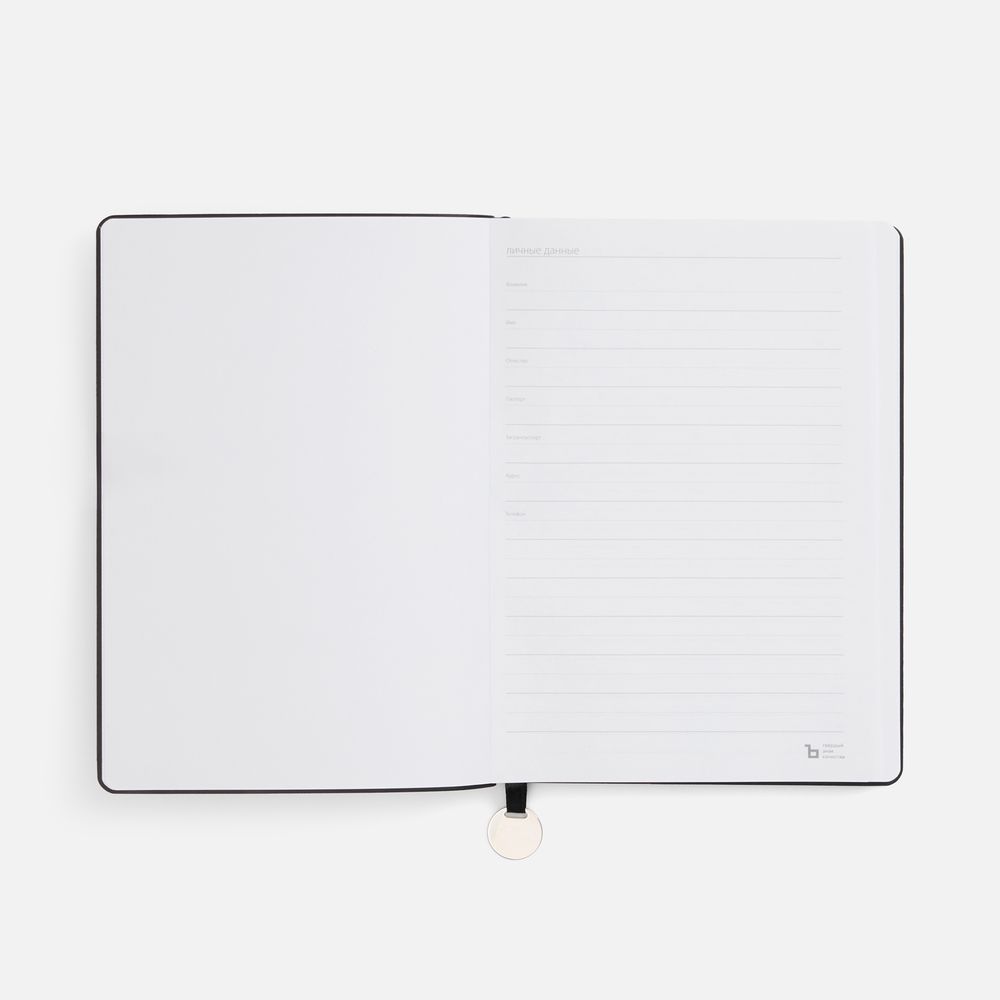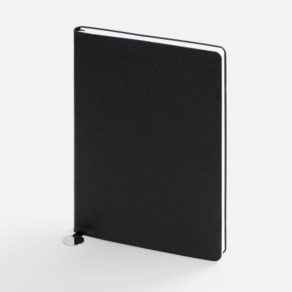 Ежедневник с гибкой обложкой, выполнен из материала La Fite, черный АА, дополнен ляссе в цвет обложки с металлическим шильдом.