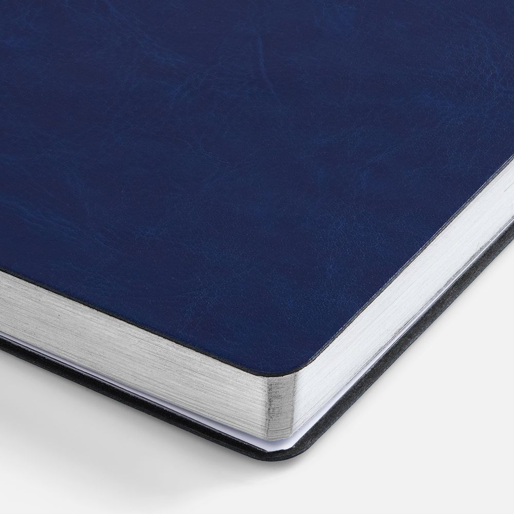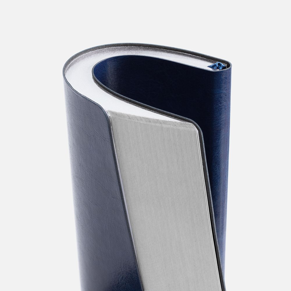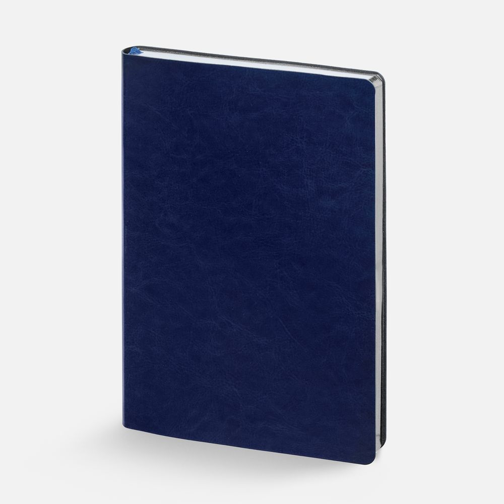 Модная интерпретация статусного ежедневника — с металлизированным обрезом и гибкой обложкой. Ежедневник с гибкой обложкой, выполнен из материала Nebraska, синий HH, дополнен ляссе темно-синего цвета.