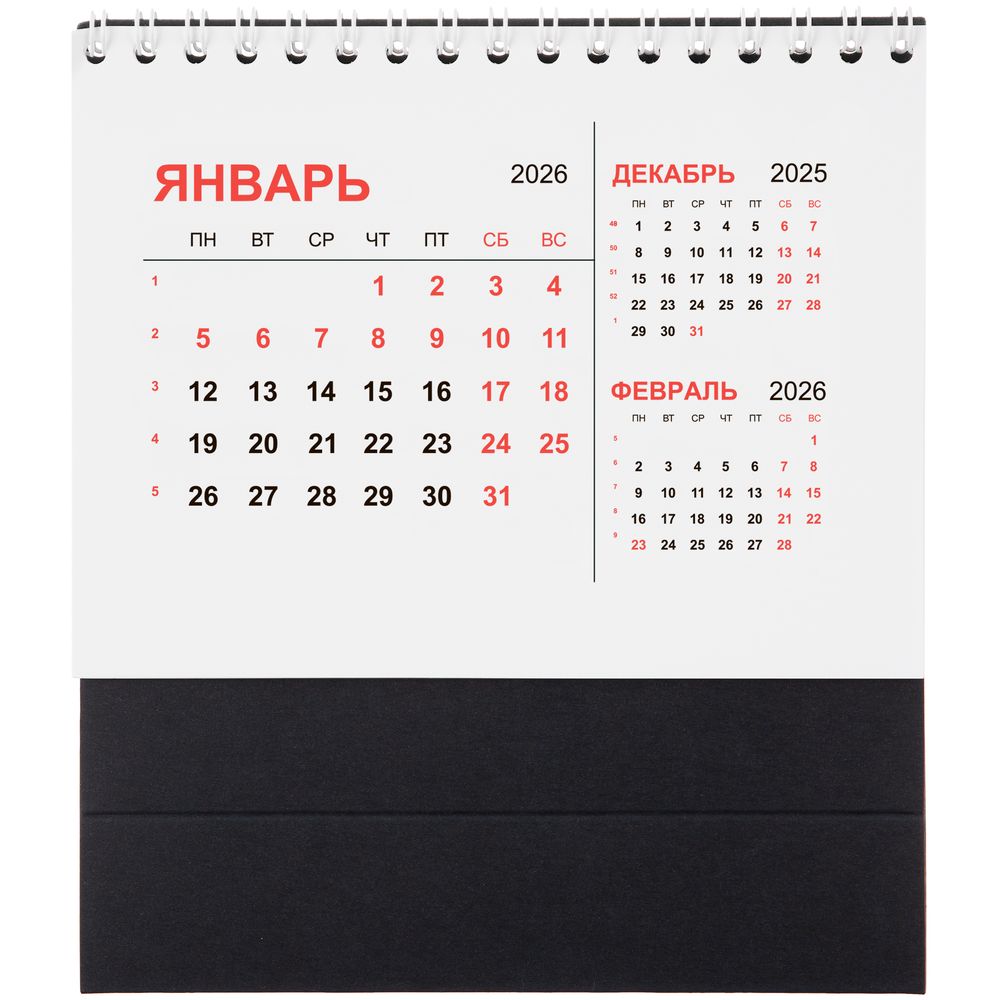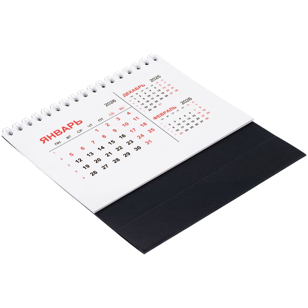 Компактный настольный календарь с датировкой на 2026 год. Основа выполнена из дизайнерской бумаги Sirio Black плотностью 290 г/м². Численник изготовлен из мелованной бумаги плотностью 130 г/м².